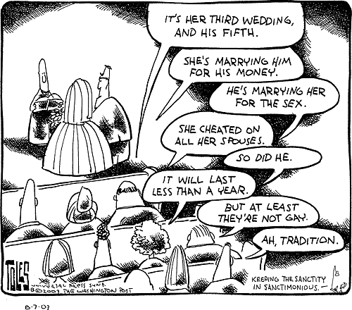 Such comics ought give those of us who are considered conservative Christians serious pause. I mean we can’t even keep our own house in order, we can’t keep marriage holy in our own circles. Yet we are so quick to go after those who want to overturn the sanctity of marriage being between a man and a woman. We can’t keep men and women together and yet we are afraid of what two men or two women will do to the sanctity of marriage. Here’s another great post that I saw that brings home this point: